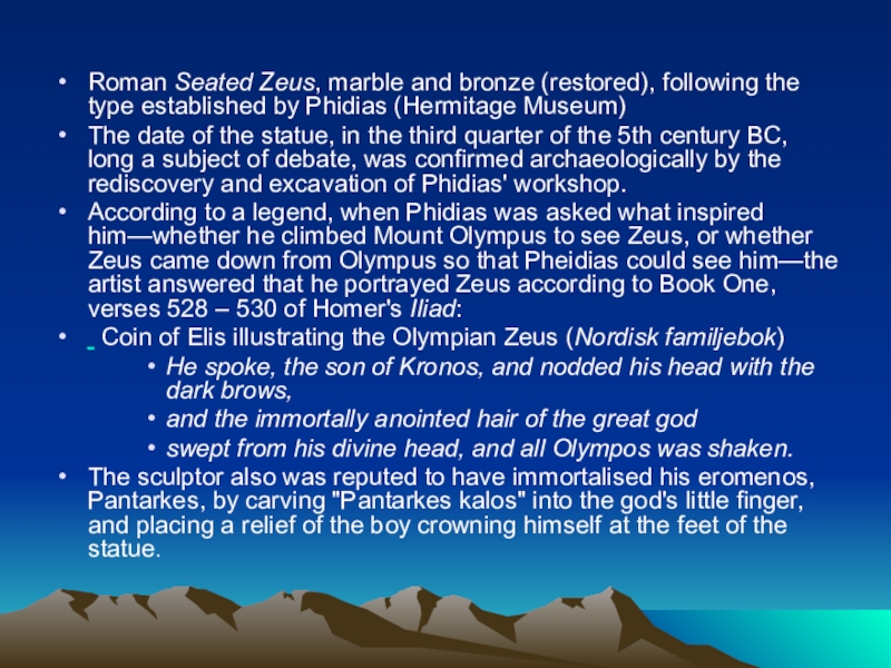 According to a legend, when Phidias was asked what inspired him—whether he climbed Mount Olympus to see Zeus, or whether Zeus came down from Olympus so that Pheidias could see him—the artist answered that he portrayed Zeus according to Book One, verses 528 – 530 of Homer's Iliad: