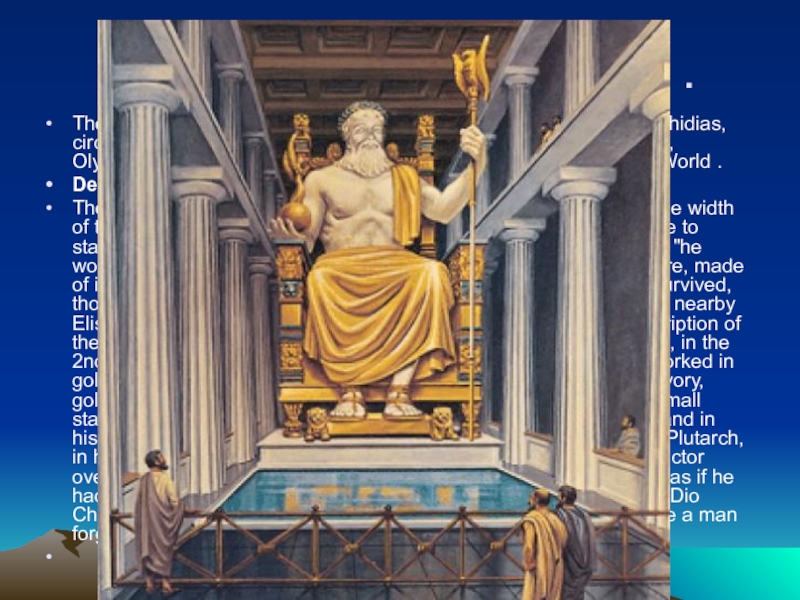The seated statue, some 12 meters (43 feet) tall, occupied half of the width of the aisle of the temple built to house it. "It seems that if Zeus were to stand up," the geographer Strabo noted early in the 1st century BC, "he would unroof the temple."The Zeus was a chryselephantine sculpture, made of ivory and gold-plated bronze. No copy in marble or bronze has survived, though there are recognizable but approximate versions on coins of nearby Elis and on Roman coins and engraved gems. A very detailed description of the sculpture and its throne was recorded by the traveler Pausanias, in the 2nd century AD. The sculpture was wreathed with shoots of olive worked in gold and seated on a magnificent throne of cedarwood, inlaid with ivory, gold, ebony, and precious stones. In Zeus' right hand there was a small statue of crowned Nike, goddess of victory, also chryselephantine, and in his left hand, a sceptre inlaid with gold, on which an eagle perched.Plutarch, in his Life of the Roman general Aemilius Paulus, records that the victor over Macedon, when he beheld the statue, “was moved to his soul, as if he had seen the god in person,” while the 1st century AD Greek orator Dio Chrysostom declared that a single glimpse of the statue would make a man forget all his earthly troubles.