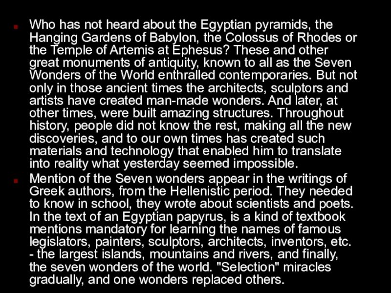 Слайд 2Who has not heard about the Egyptian pyramids, the Hanging Gardens