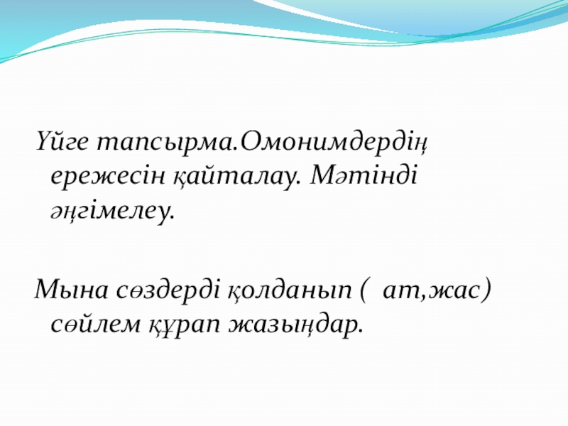 Слайд 10Үйге тапсырма.Омонимдердің ережесін қайталау. Мәтінді әңгімелеу.