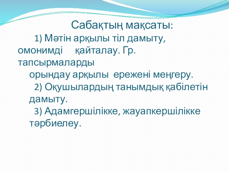 Сабақтың мақсаты: 1) Мәтін арқылы тіл дамыту, омонимді қайталау. Гр. тапсырмаларды