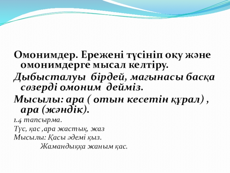 Слайд 5Омонимдер. Ережені түсініп оқу және омонимдерге мысал келтіру.