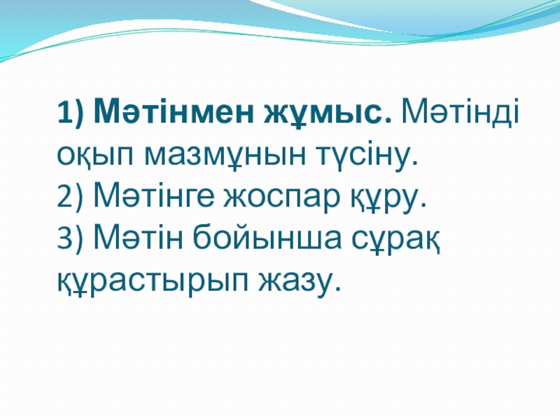 Слайд 41) Мәтінмен жұмыс. Мәтінді оқып мазмұнын түсіну. 2) Мәтінге жоспар құру. 3) Мәтін