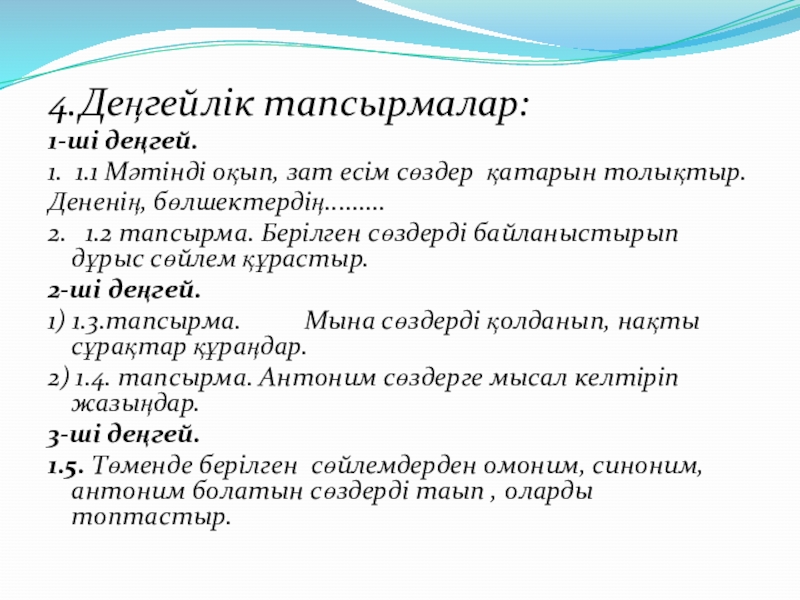 4.Деңгейлік тапсырмалар:1-ші деңгей.1. 1.1 Мәтінді оқып, зат есім сөздер қатарын толықтыр.Дененің, бөлшектердің.........2.  1.2 тапсырма. Берілген сөздерді