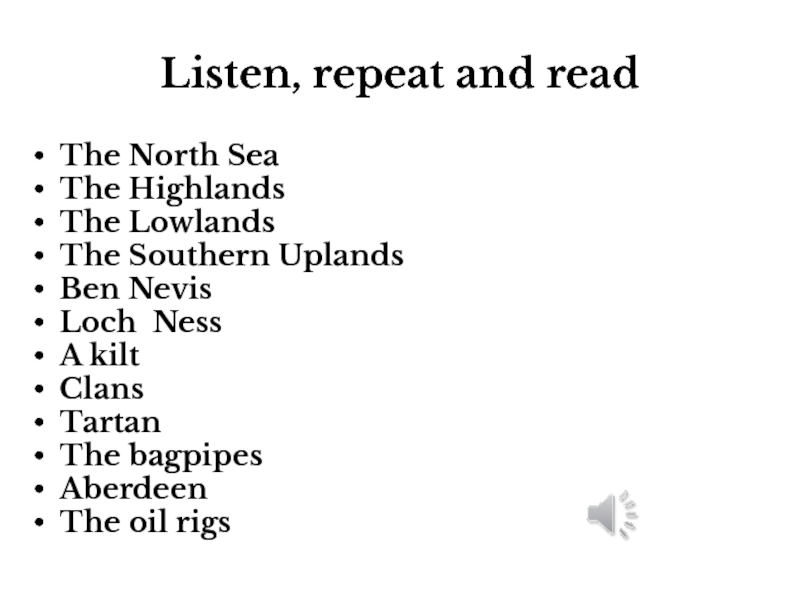 Listen, repeat and readThe North SeaThe HighlandsThe LowlandsThe Southern UplandsBen NevisLoch NessA kiltClansTartanThe bagpipesAberdeenThe oil rigs