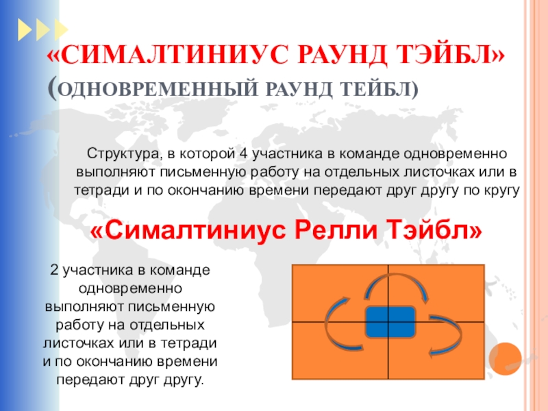 2 участника в команде одновременно выполняют письменную работу на отдельных листочках или в тетради и по окончанию времени передают друг другу.