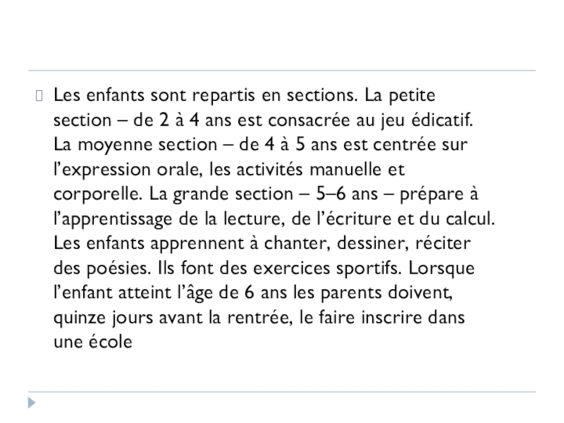 Слайд 7Les enfants sont repartis en sections. La petite section – de