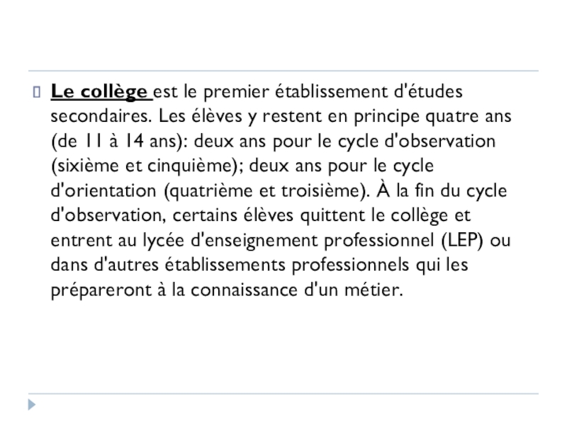 restent en principe quatre ans (de 11 à 14 ans): deux ans pour le cycle d'observation (sixième et cinquième); deux ans pour le cycle d'orientation (quatrième et troisième). À la fin du cycle d'observation, certains élèves quittent le collège et entrent au lycée d'enseignement professionnel (LEP) ou dans d'autres établissements professionnels qui les prépareront à la connaissance d'un métier.