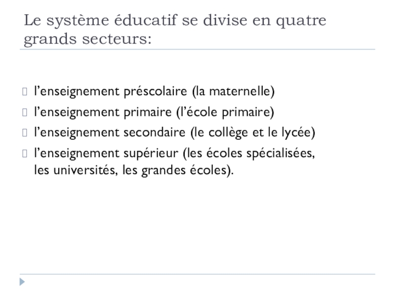 Слайд 3Le système éducatif se divise en quatre grands secteurs: