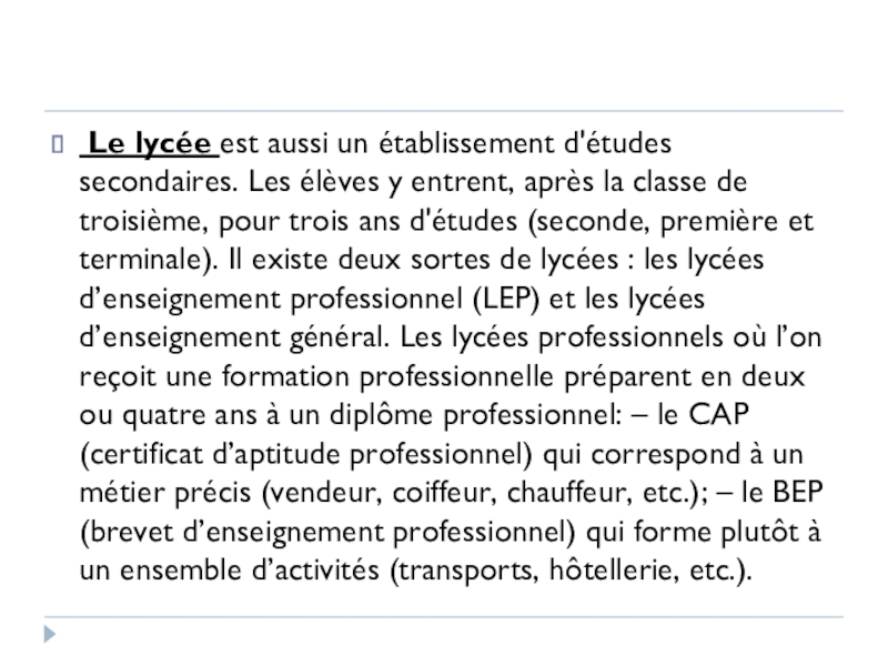 entrent, après la classe de troisième, pour trois ans d'études (seconde, première et terminale). Il existe deux sortes de lycées : les lycées d’enseignement professionnel (LEP) et les lycées d’enseignement général. Les lycées professionnels où l’on reçoit une formation professionnelle préparent en deux ou quatre ans à un diplôme professionnel: – le CAP (certificat d’aptitude professionnel) qui correspond à un métier précis (vendeur, coiffeur, chauffeur, etc.); – le BEP (brevet d’enseignement professionnel) qui forme plutôt à un ensemble d’activités (transports, hôtellerie, etc.).