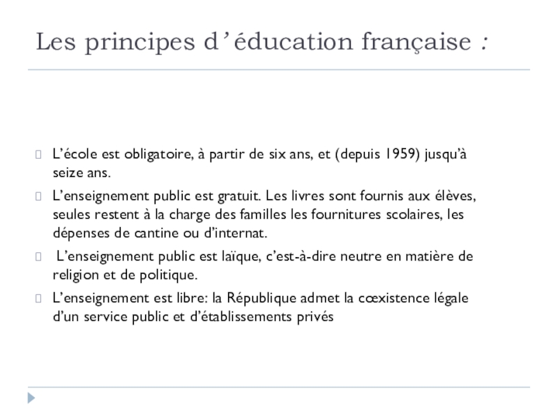 Слайд 2Les principes d’ éducation française :