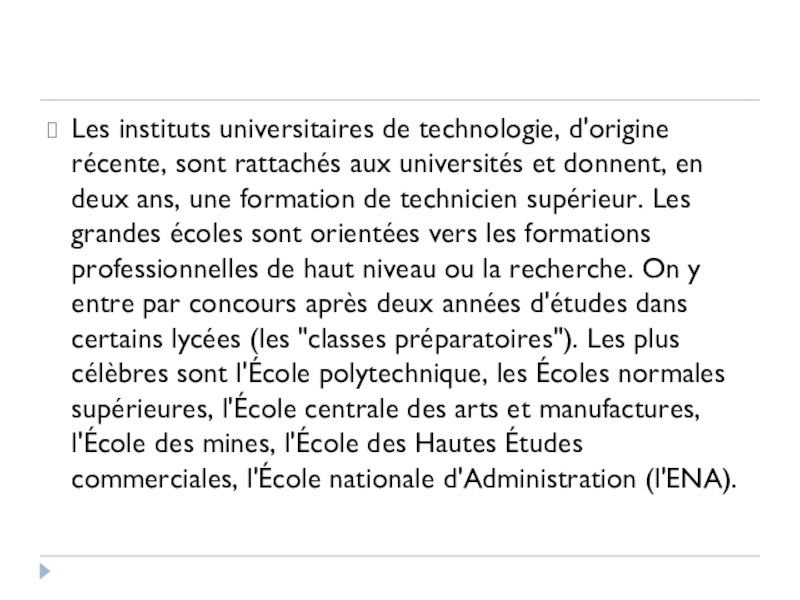 et donnent, en deux ans, une formation de technicien supérieur. Les grandes écoles sont orientées vers les formations professionnelles de haut niveau ou la recherche. On y entre par concours après deux années d'études dans certains lycées (les "classes préparatoires"). Les plus célèbres sont l'École polytechnique, les Écoles normales supérieures, l'École centrale des arts et manufactures, l'École des mines, l'École des Hautes Études commerciales, l'École nationale d'Administration (l'ENA).