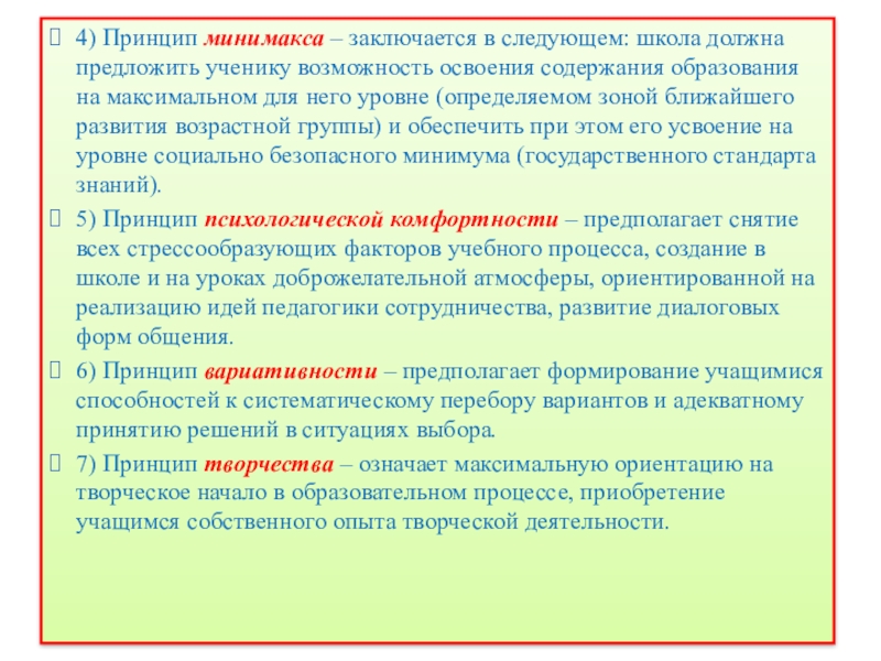 3) Принцип целостности – предполагает формирование учащимися обобщенного системного представления о мире (природе, обществе, самом себе, социокультурном мире и мире деятельности, о роли и месте каждой науки в системе наук).