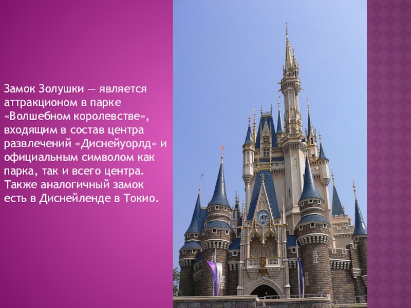 Золушка — принцесса вымышленного французского королевства. Стала принцессой, выйдя замуж за принца. Родилась в обычной семье. Когда её мать умерла, её отец женился на другой женщине, Леди Тремейн. Имеет двух сводных сестёр — Дризеллу и Анастасию. Терпеливая и нежная девушка. По происхождению француженка.