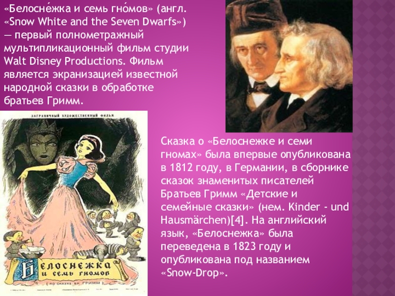 Сказка о «Белоснежке и семи гномах» была впервые опубликована в 1812 году, в Германии, в сборнике сказок знаменитых писателей Братьев Гримм «Детские и семейные сказки» (нем. Kinder - und Hausmärchen)[4]. На английский язык, «Белоснежка» была переведена в 1823 году и опубликована под названием «Snow-Drop».