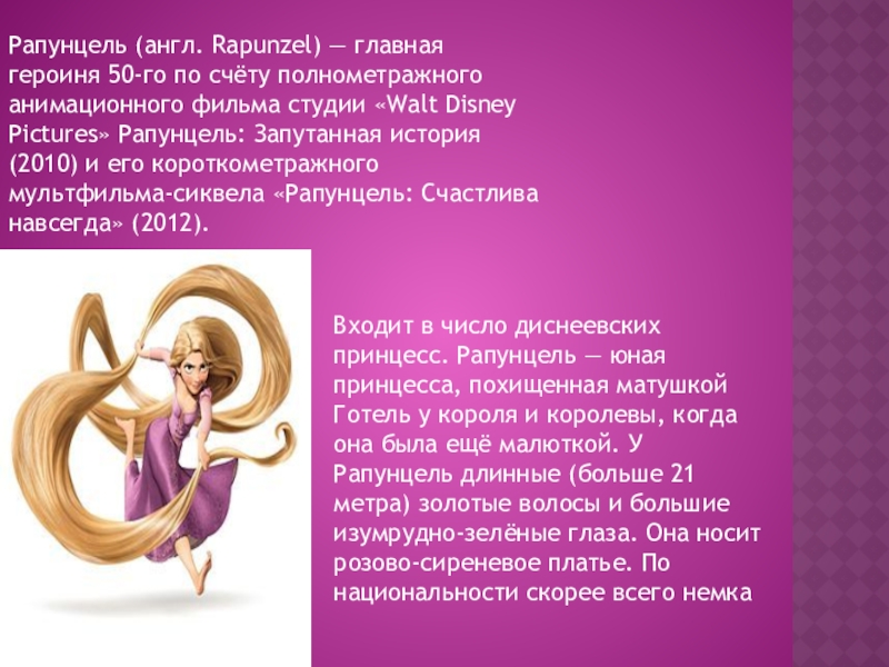 Рапунцель (англ. Rapunzel) — главная героиня 50-го по счёту полнометражного анимационного фильма студии «Walt Disney Pictures» Рапунцель: Запутанная история (2010) и его короткометражного мультфильма-сиквела «Рапунцель: Счастлива навсегда» (2012).