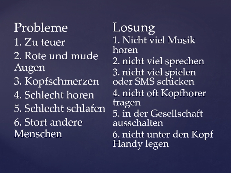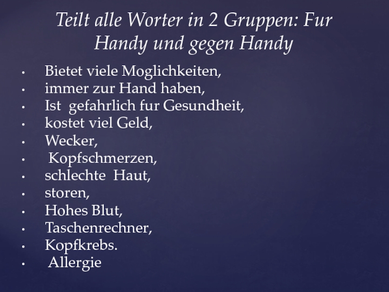 Teilt alle Worter in 2 Gruppen: Fur Handy und gegen Handy