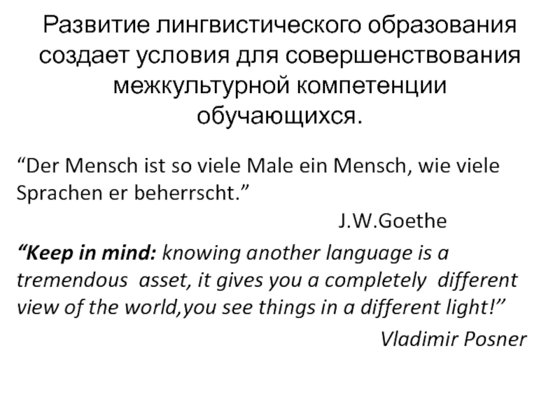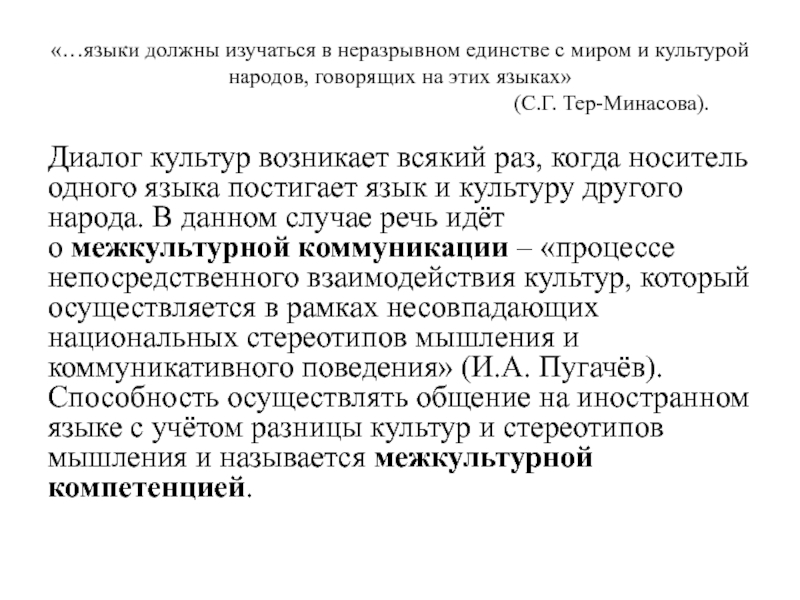 Диалог культур возникает всякий раз, когда носитель одного языка постигает язык и культуру другого народа. В данном случае речь идёт о межкультурной коммуникации – «процессе непосредственного взаимодействия культур, который осуществляется в рамках несовпадающих национальных стереотипов мышления и коммуникативного поведения» (И.А. Пугачёв). Способность осуществлять общение на иностранном языке с учётом разницы культур и стереотипов мышления и называется межкультурной компетенцией.