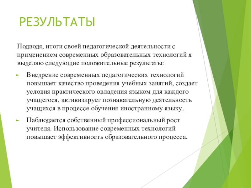 Наблюдается собственный профессиональный рост учителя. Использование современных технологий повышает эффективность образовательного процесса.