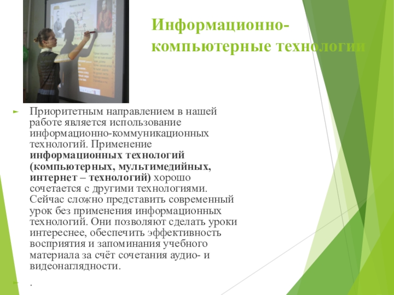 Приоритетным направлением в нашей работе является использование информационно-коммуникационных технологий. Применение
