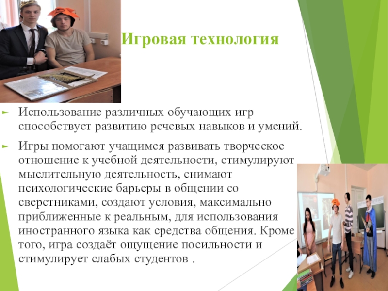 Игры помогают учащимся развивать творческое отношение к учебной деятельности, стимулируют мыслительную деятельность, снимают психологические барьеры в общении со сверстниками, создают условия, максимально приближенные к реальным, для использования иностранного языка как средства общения. Кроме того, игра создаёт ощущение посильности и стимулирует слабых студентов .