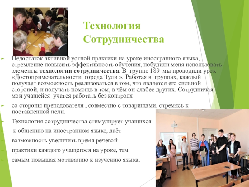 повысить эффективность обучения, побудили меня использовать элементы технологии сотрудничества. В группе 189 мы проводили урок «Достопримечательности города Тули ». Работая в группах, каждый получает возможность реализоваться в том, что является его сильной стороной, и получать помощь в том, в чём он слабее других. Сотрудничая, мои учащейся учатся работать без контроля