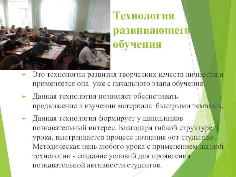 Данная технология формирует у школьников познавательный интерес. Благодаря гибкой структуре урока, выстраивается процесс познания «от студента». Методическая цель любого урока с применением данной технологии - создание условий для проявления познавательной активности студентов.
