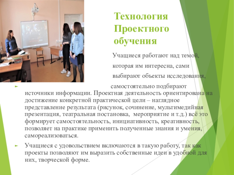 Учащиеся с удовольствием включаются в такую работу, так как проекты позволяют им выразить собственные идеи в удобной для них, творческой форме.