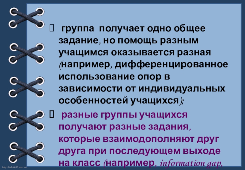 разные группы учащихся получают разные задания, которые взаимодополняют друг друга при последующем выходе на класс (например, information gap, разность информационных потенциалов);