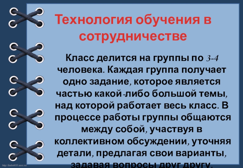 Каждая группа получает одно задание, которое является частью какой-либо большой темы, над которой работает весь класс. В процессе работы группы общаются между собой, участвуя в коллективном обсуждении, уточняя детали, предлагая свои варианты, задавая вопросы друг другу.