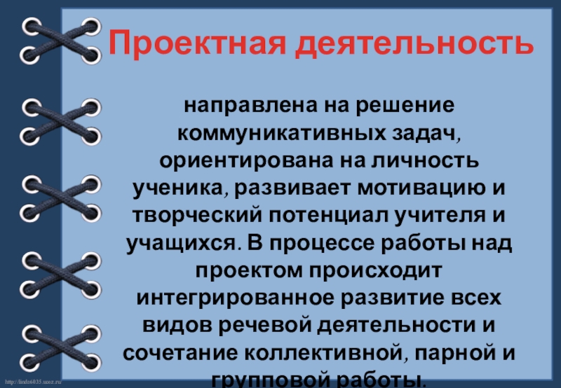 развивает мотивацию и творческий потенциал учителя и учащихся. В процессе работы над проектом происходит интегрированное развитие всех видов речевой деятельности и сочетание коллективной, парной и групповой работы.