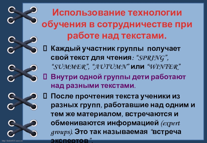 Слайд 13Использование технологии обучения в сотрудничестве при работе над текстами.