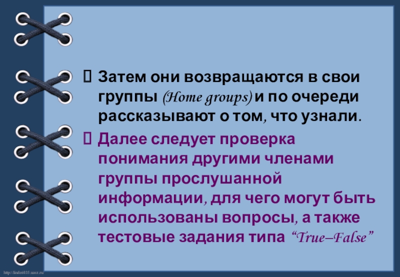 Далее следует проверка понимания другими членами группы прослушанной информации, для чего могут быть использованы вопросы, а также тестовые задания типа “True–False”