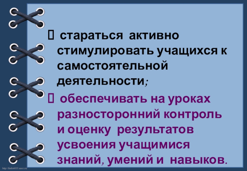 Слайд 8 стараться активно стимулировать учащихся к самостоятельной деятельности;