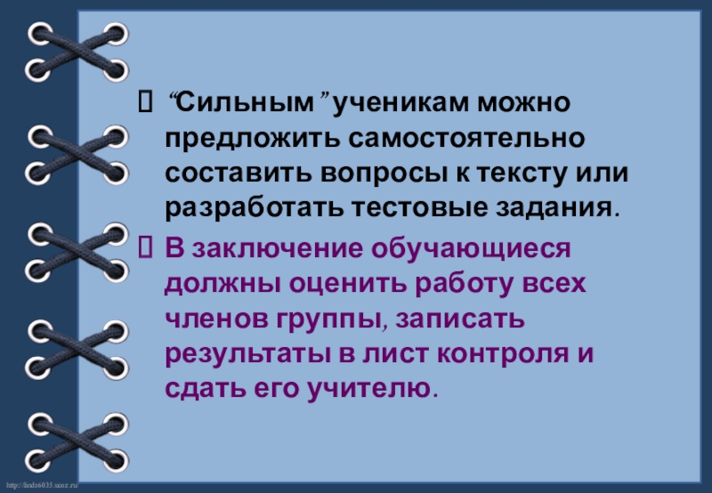 Слайд 15“Сильным” ученикам можно предложить самостоятельно составить вопросы к тексту или разработать