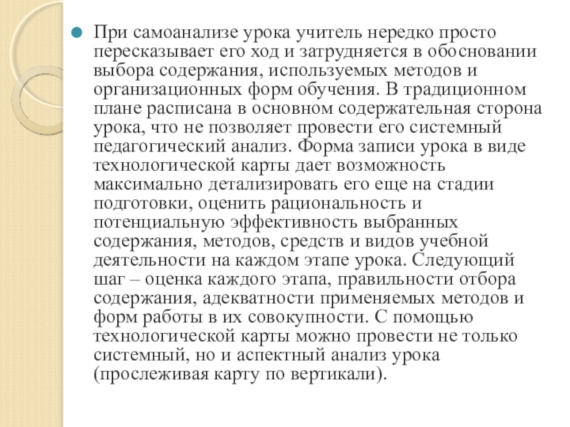 в обосновании выбора содержания, используемых методов и организационных форм обучения. В традиционном плане расписана в основном содержательная сторона урока, что не позволяет провести его системный педагогический анализ. Форма записи урока в виде технологической карты дает возможность максимально детализировать его еще на стадии подготовки, оценить рациональность и потенциальную эффективность выбранных содержания, методов, средств и видов учебной деятельности на каждом этапе урока. Следующий шаг – оценка каждого этапа, правильности отбора содержания, адекватности применяемых методов и форм работы в их совокупности. С помощью технологической карты можно провести не только системный, но и аспектный анализ урока (прослеживая карту по вертикали).