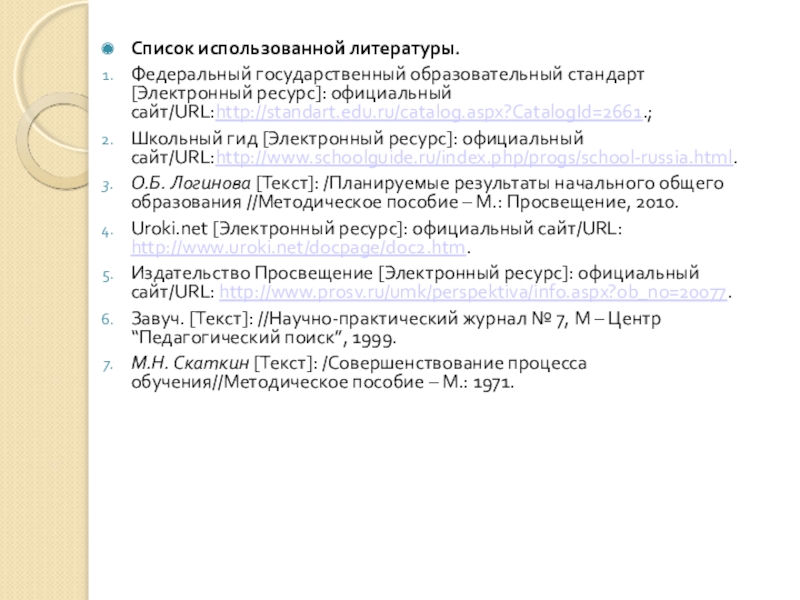 О.Б. Логинова [Текст]: /Планируемые результаты начального общего образования //Методическое пособие – М.: Просвещение, 2010.
