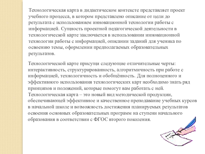 Технологической карте присущи следующие отличительные черты: интерактивность, структурированность, алгоритмичность при работе с информацией, технологичность и обобщённость. Для полноценного и эффективного использования технологических карт необходимо знать ряд принципов и положений, которые помогут вам работать с ней. Технологическая карта – это новый вид методической продукции, обеспечивающей эффективное и качественное преподавание учебных курсов в начальной школе и возможность достижения планируемых результатов освоения основных образовательных программ на ступени начального образования в соответствии с ФГОС второго поколения.