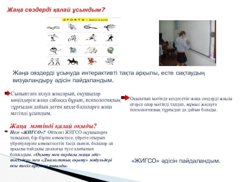 Сыныптаға ахаул жақсарып, оқушылар көңілдерін жаңа сабаққа бұрып, психологиялық тұрғыдан дайын деген кезде балаларға жаңа мәтінді ұсындым.