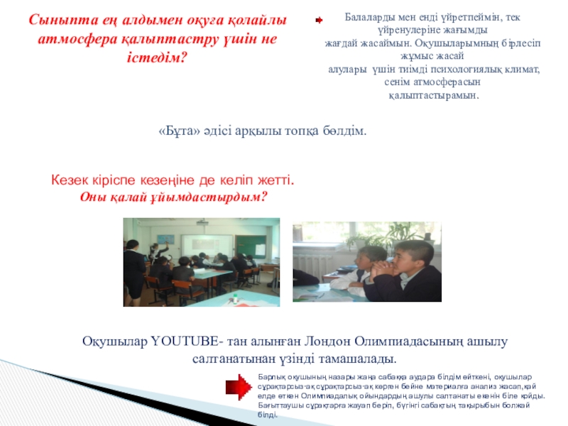 Барлық оқушының назары жаңа сабаққа аудара білдім өйткені, оқушылар сұрақтарсыз-ақ сұрақтарсыз-ақ көрген бейне материалға анализ жасап,қай елде өткен Олимпиадалық ойындардың ашулы салтанаты екенін біле қойды. Бағыттаушы сұрақтарға жауап беріп, бүгінгі сабақтың тақырыбын болжай білді.