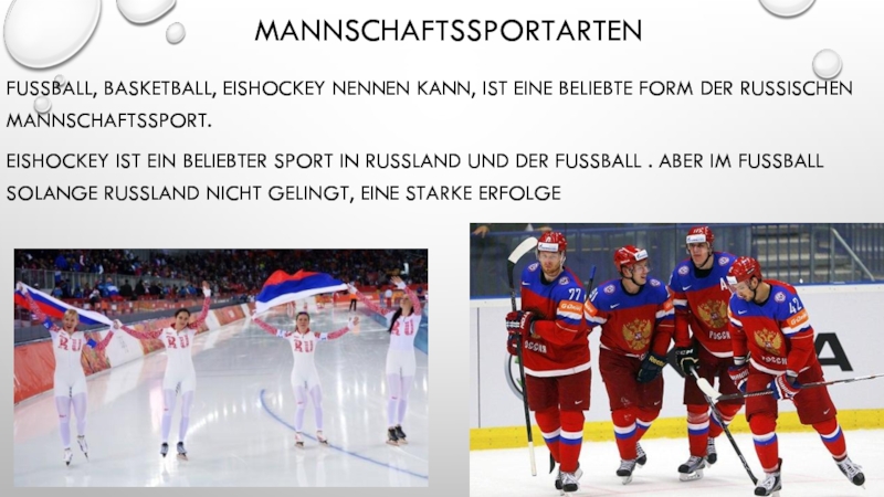 MannschaftssportartenFußball, Basketball, Eishockey nennen kann, ist eine beliebte Form der Russischen mannschaftssport.Eishockey ist ein beliebter Sport in