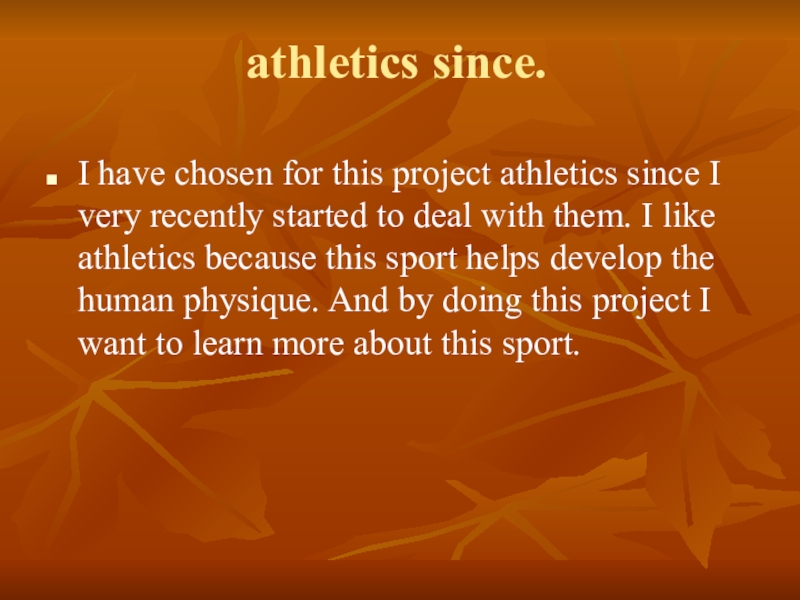 athletics since.I have chosen for this project athletics since I very recently started to deal with them. I like athletics because this sport helps develop the human physique. And by doing this project I want to