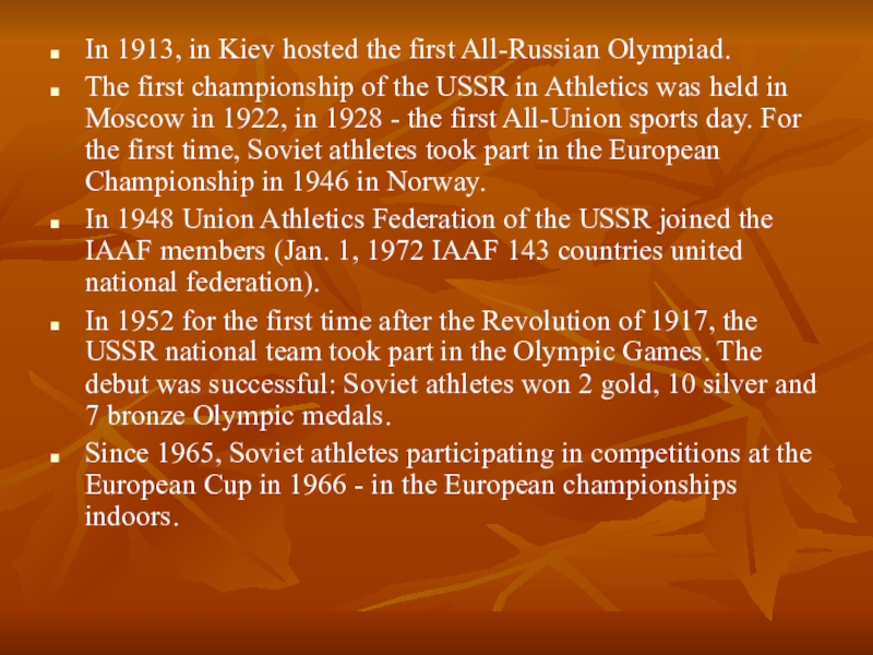 of the USSR in Athletics was held in Moscow in 1922, in 1928 - the first All-Union sports day. For the first time, Soviet athletes took part in the European Championship in 1946 in Norway.