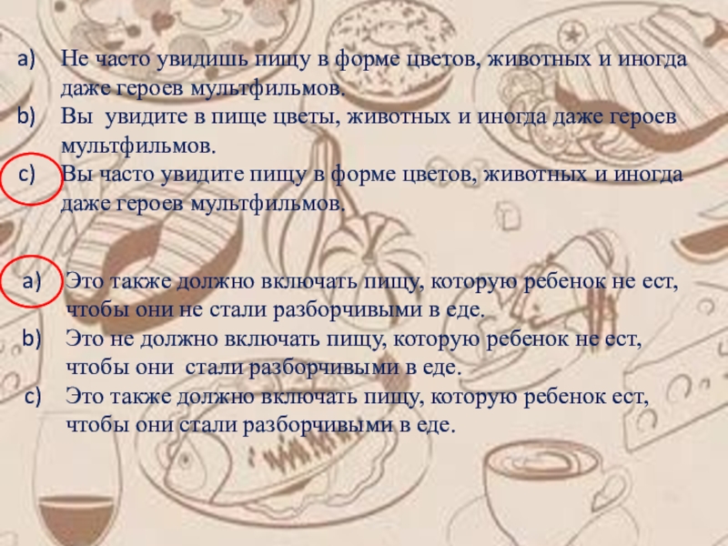 Это не должно включать пищу, которую ребенок не ест, чтобы они стали разборчивыми в еде.