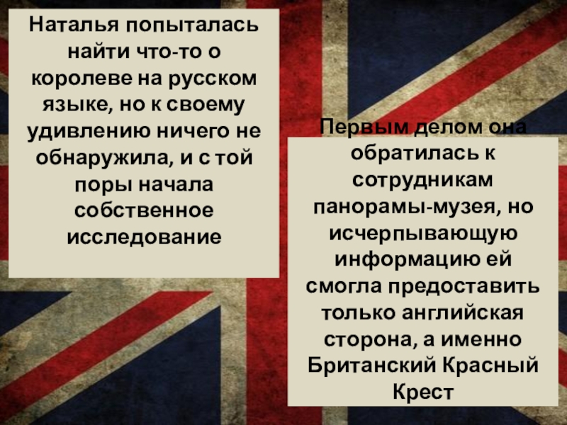 Первым делом она обратилась к сотрудникам панорамы-музея, но исчерпывающую информацию ей смогла предоставить только английская сторона, а именно Британский Красный Крест