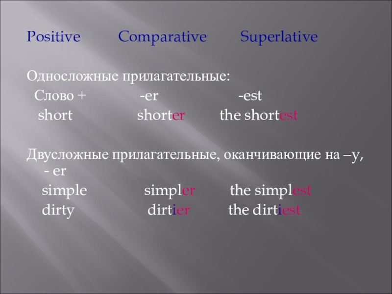 Positive     Comparative     Superlative Односложные прилагательные: Слово +