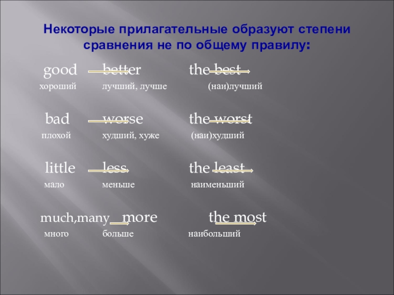 Некоторые прилагательные образуют степени сравнения не по общему правилу:	good		better			 the best  хороший		лучший, лучше		  (наи)лучший