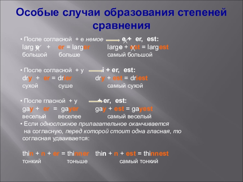 Особые случаи образования степеней сравнения После согласной + е немое      е +