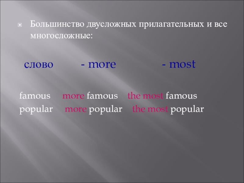 Большинство двусложных прилагательных и все многосложные: слово     - more