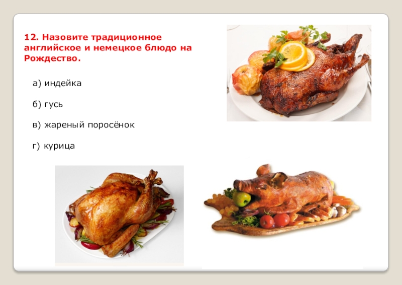 12. Назовите традиционное английское и немецкое блюдо на Рождество.а) индейкаб) гусьв) жареный поросёнокг) курица